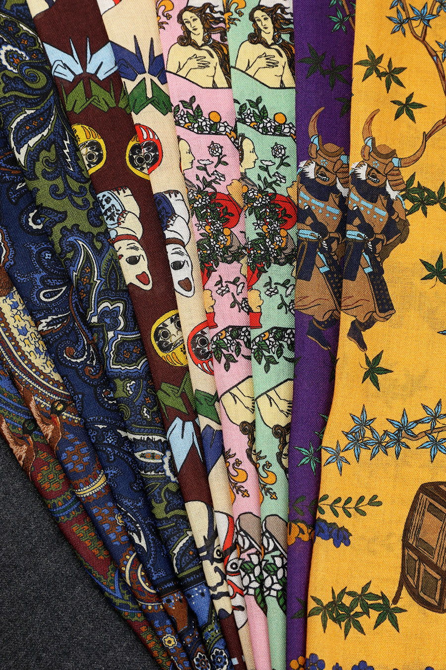 We've just received our new fall/winter pocket square collection, featuring silk, wool/silk, and vintage kimono silk. The collection includes colorful prints that are easy to pair with your favorite flannel suits and tweed jackets. Printed in Macclesfield and Kyoto, hand-rolled in Florence.