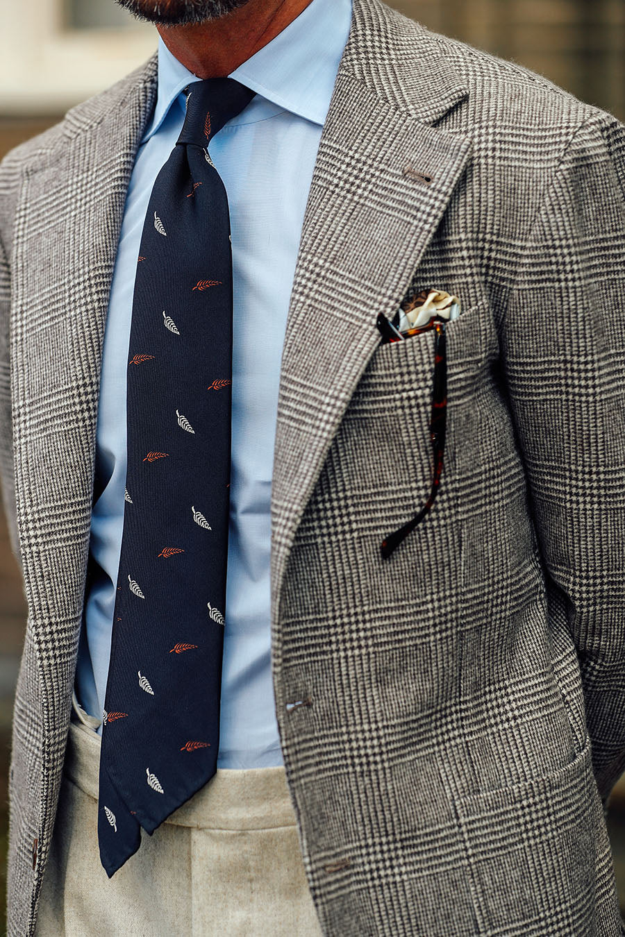In the quiet hills of the British countryside lies the traditional heart of English silk printing: Macclesfield. Once home to numerous manufactories that produced the inimitable screen-printed silk connoisseurs love so dearly, today there are only two left that produce what internationally became known as “British Neats”. But nowadays, they’re also able to print pocket squares using ink jet machines, easily identifiable by the discreet white sheen of the backside (when using block print, the fabric is colored in a ground tone). This modern printing method is best suited for light, more summery colors, which is why we used it here.